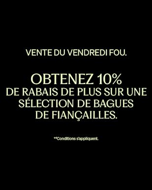 Le Vendredi noir tombe traditionnellement le dernier vendredi de novembre, donc en 2025, ce sera le 28 novembre. Profitez de nos offres sur les bijoux du Vendredi noir, incluant des bagues de fiançailles, des bijoux en argent, des pièces en or et des créations pour hommes, pour tirer le meilleur parti de la vente.