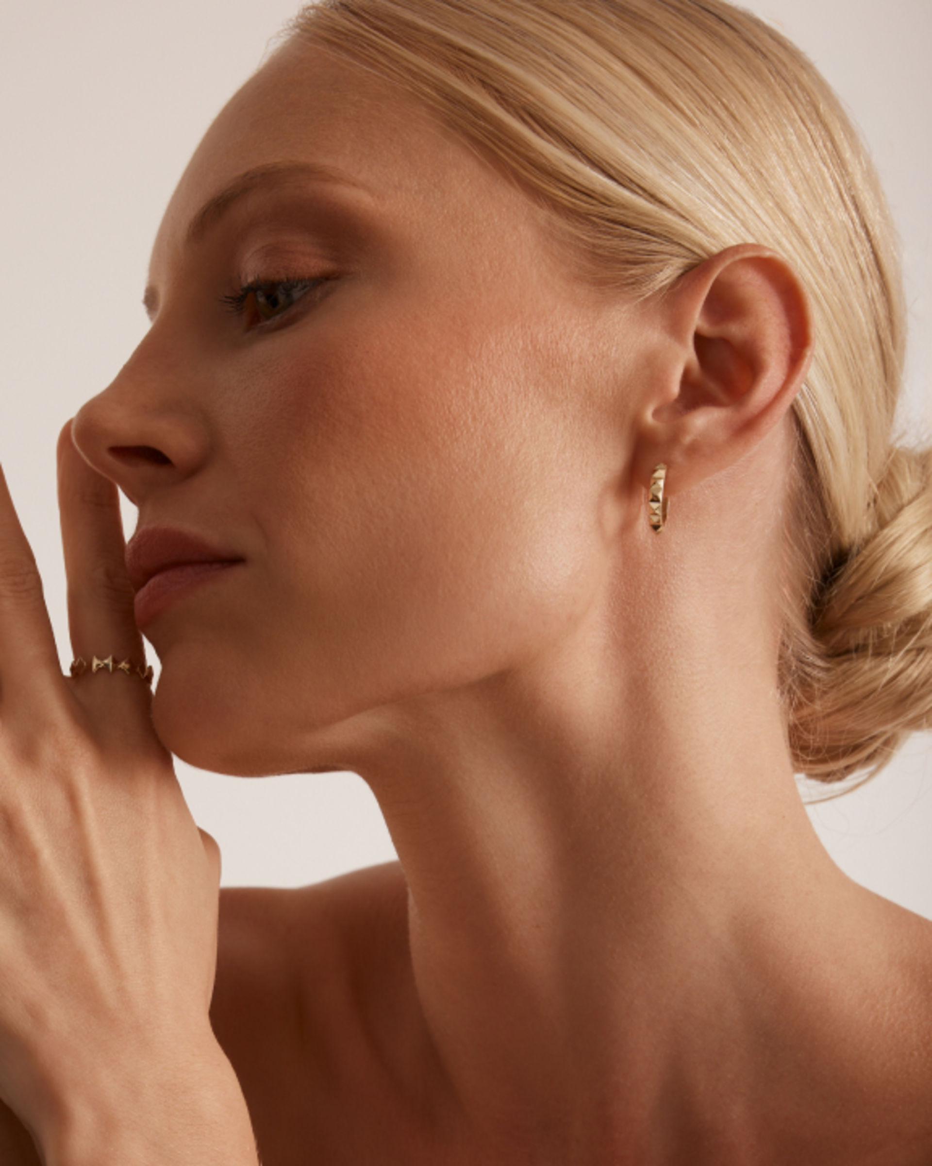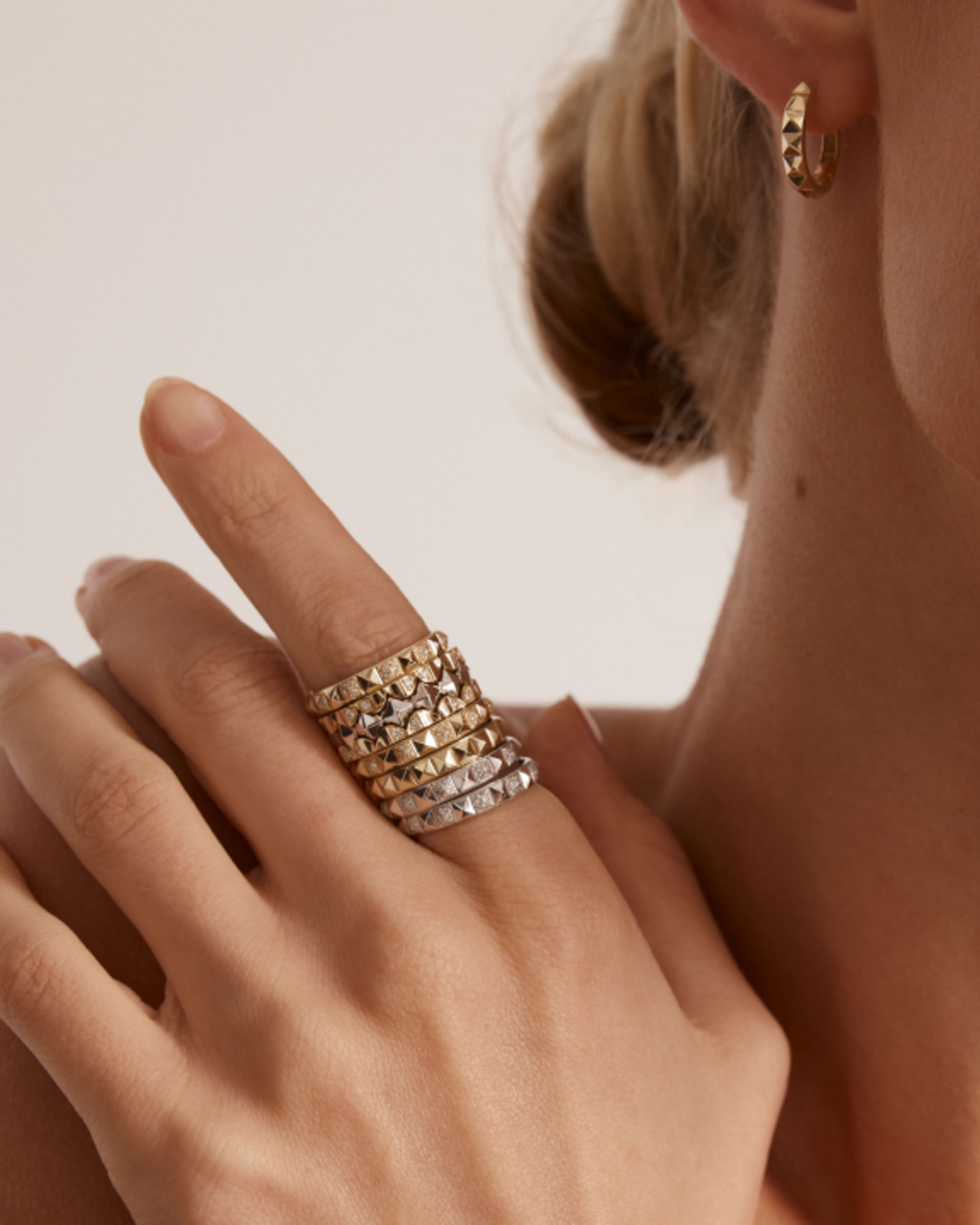 Découvrez trois bagues distinctives : la bague Curve, profilée pour un ajustement parfait ; la bague Point, conçue pour compléter votre superposition ; et la bague Linear, une pièce de base raffinée. Complétez votre look avec le bracelet rigide Signature, des boucles d’oreilles créoles sculpturales ou une silhouette de boucle pendante.